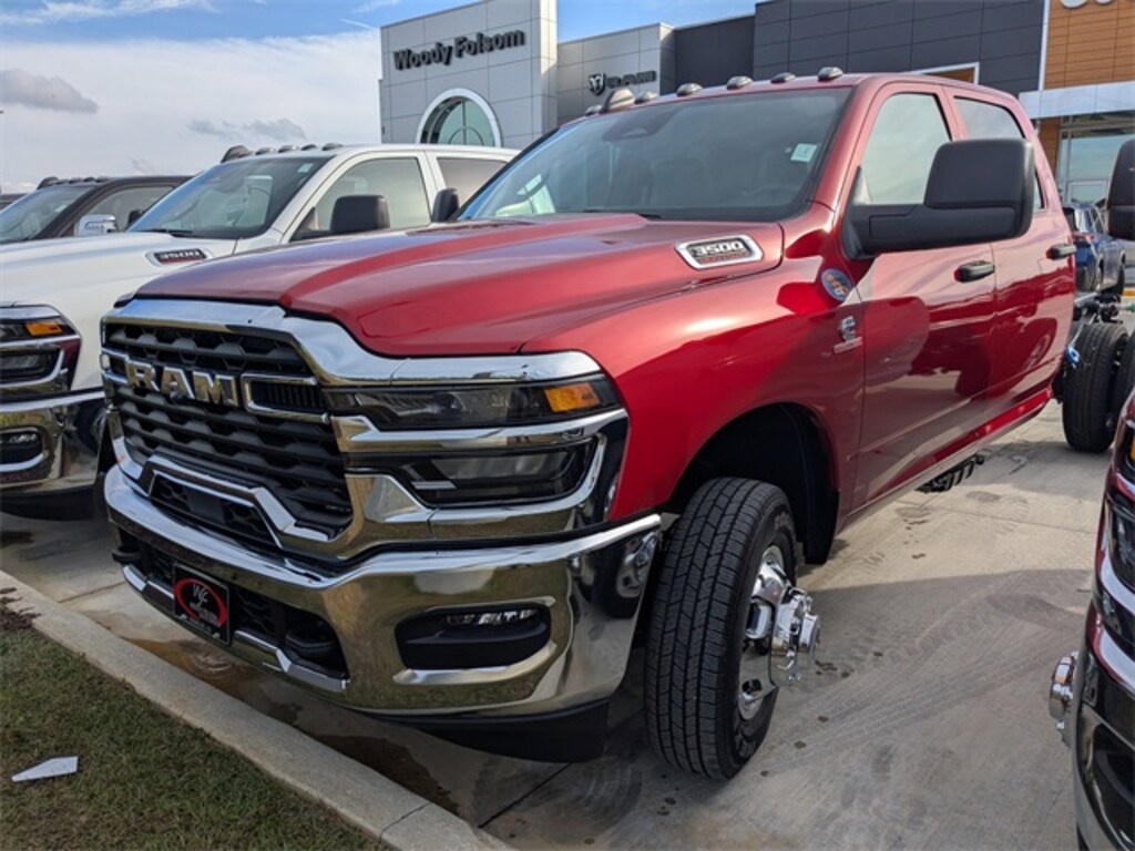 Molten Red Pearlcoat 2026 Ram 3500 Tradesman 172 WB 4WD 8-Speed Automatic Cummins 6.7L I6 Turbodiesel 11.50" Dual Wheels Rear Axle, 2 Way Rear Headrest Seat, 4-Wheel Disc Brakes, 40/20/40 Split Bench Seat, 4G LTE Wi-Fi Hot Spot, 52 & 22 Gallon Dual Fuel Tanks, 6 Speakers, 6000# Front Axle w/Hub Ext, ABS brakes, Air Conditioning, AM/FM radio: SiriusXM, Apple CarPlay, Apple CarPlay/Android Auto, Black Exterior Mirrors, Black Wheel Center Hub, Bright Front Bumper, Bright Wheel Skins, Center Hub, Chrome Appearance Group A, Chrome Grille Surround, Compass, Connectivity - US/Canada, Delay-off headlights, Driver door bin, Dual front impact airbags, Dual Rear Wheels, Electronic Stability Control, Emergency communication system: RAM Connect, For Details, Visit DriveUconnect.com, Front anti-roll bar, Front Armrest w/Cupholders, Front Center Armrest w/Storage, Front fog lights, Front License Plate Bracket, Front reading lights, Fully automatic headlights, Global Telematics Box Module (TBM), Google Android Auto, GPS Antenna Input, HD Vinyl 40/20/40 Split Bench Seat, Illuminated entry, Integrated Voice Command w/Bluetooth, Manual Adjust 4-Way Driver Seat, Manual Adjust 4-Way Front Passenger Seat, Manual Folding Exterior Mirrors, Manual Telescoping Mirrors, Matte Black Mesh Grille w/Chrome, Nexen Brand Tires, Occupant sensing airbag, Outside temperature display, Overhead console, Panic alarm, ParkView Rear Back-Up Camera, Passenger door bin, Passenger vanity mirror, Power steering, Power windows, Quick Order Package 25A Tradesman, Radio data system, Radio: Uconnect 5 w/8.4" Display, Rear anti-roll bar, Rear Folding Seat, Remote keyless entry, Remote USB Port - Charge Only, Speed control, Storage Tray, Tachometer, Temperature & Compass Gauge, Tilt steering wheel, Traction control, Trailer Brake Control, Trailer Light Check, Variably intermittent wipers, Voltmeter, Wheels: 17" x 6.0" Steel Chrome Clad, Wheels: 18" x 8.0" Polished Aluminum, Wheels: 18" x 8.0" Steel Painted.